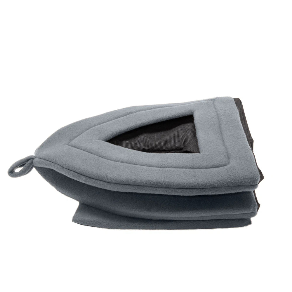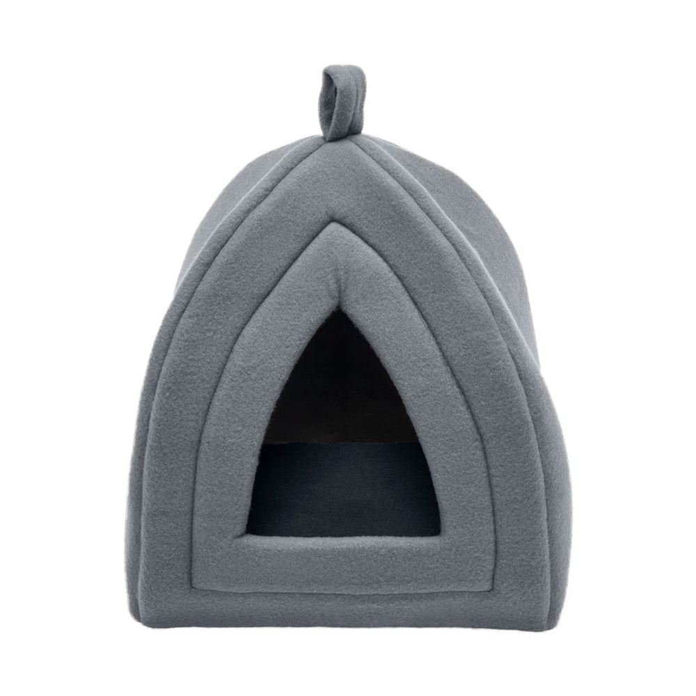 This pet bed has a gray dome shaped design with a soft fabric exterior It features an enclosed space with a triangular opening providing pets a warm and secure area to rest The compact dome shape fits easily in home corners and the neutral gray color blends with various decor styles It is suitable for cats and small dogs to hide or relax ideal for daily indoor use